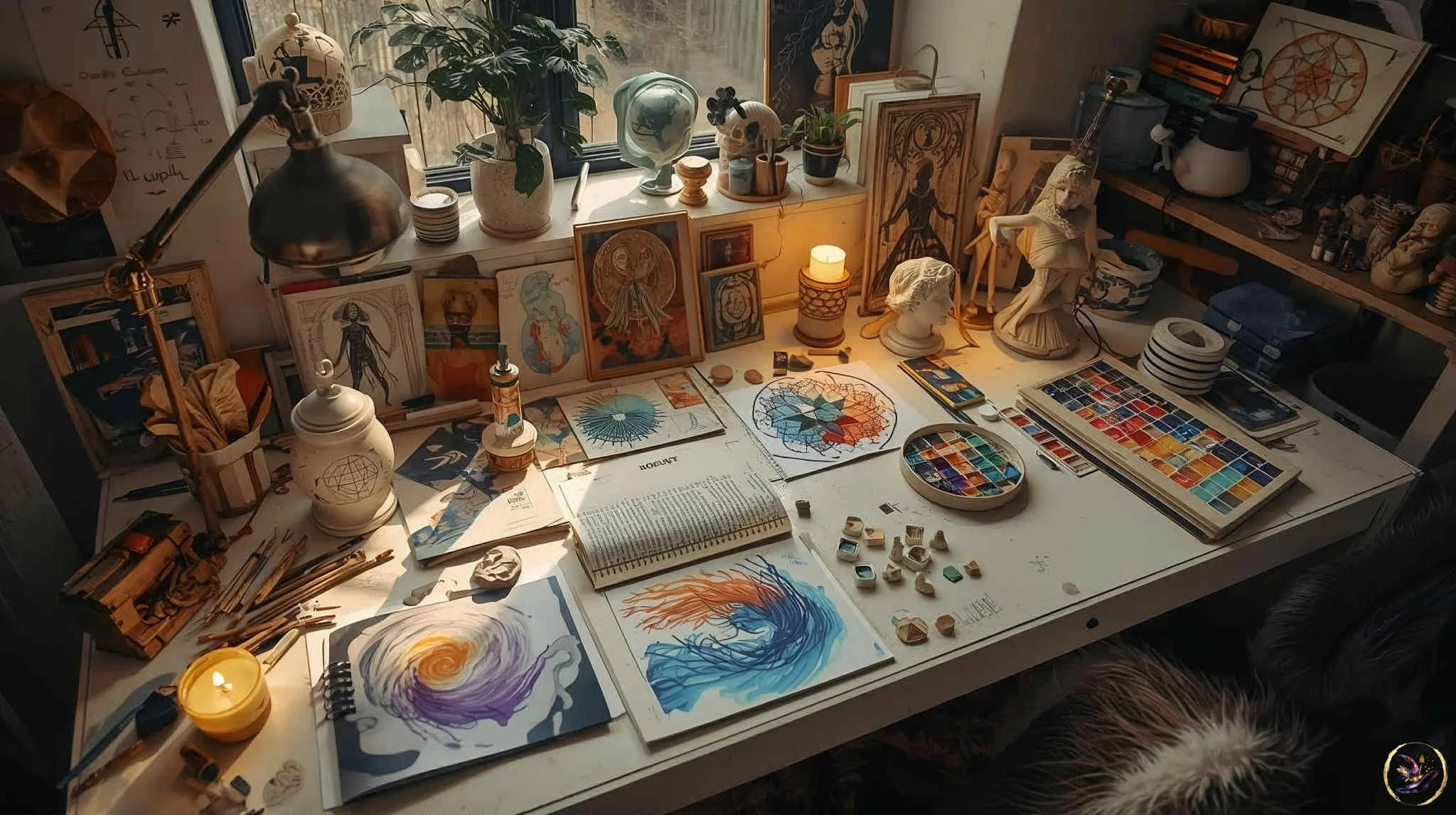Moonlight from the Leo Full Moon streams through an open window, illuminating an art journal, paintbrushes, a quiet moment of magic and creation in the night.